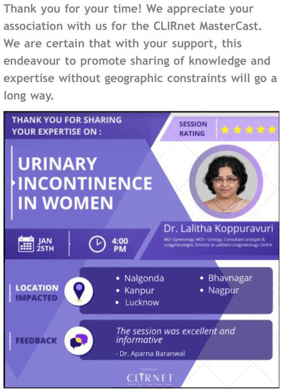 Then I came across Dr. Lalitha’s Urogynecology Clinic in Hyderabad. I immediately flew in from Chandigarh to Hyderabad to consult Dr. Lalitha for the problem that I was having. She then advised me a laser treatment (femilift). The procedure takes less than 15 minutes, has three sittings and is pretty much painless. Dr. Lalitha was very accommodating and explained the procedure very well. I felt most relief after my second session and after third session I was very satisfied with the results. I highly recommend this procedure. It changed my life, I hope it changes yours too!